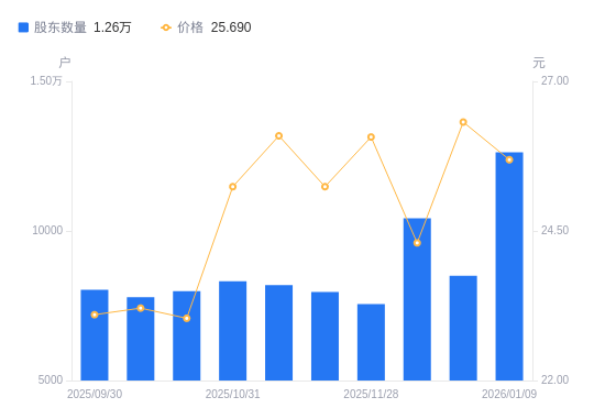 近一年(2025年1月27日至2026年1月9日),楚环科技A股股东户数从8496户,增加至1.26万户,增幅48.68%,区间股价上涨40.76%。